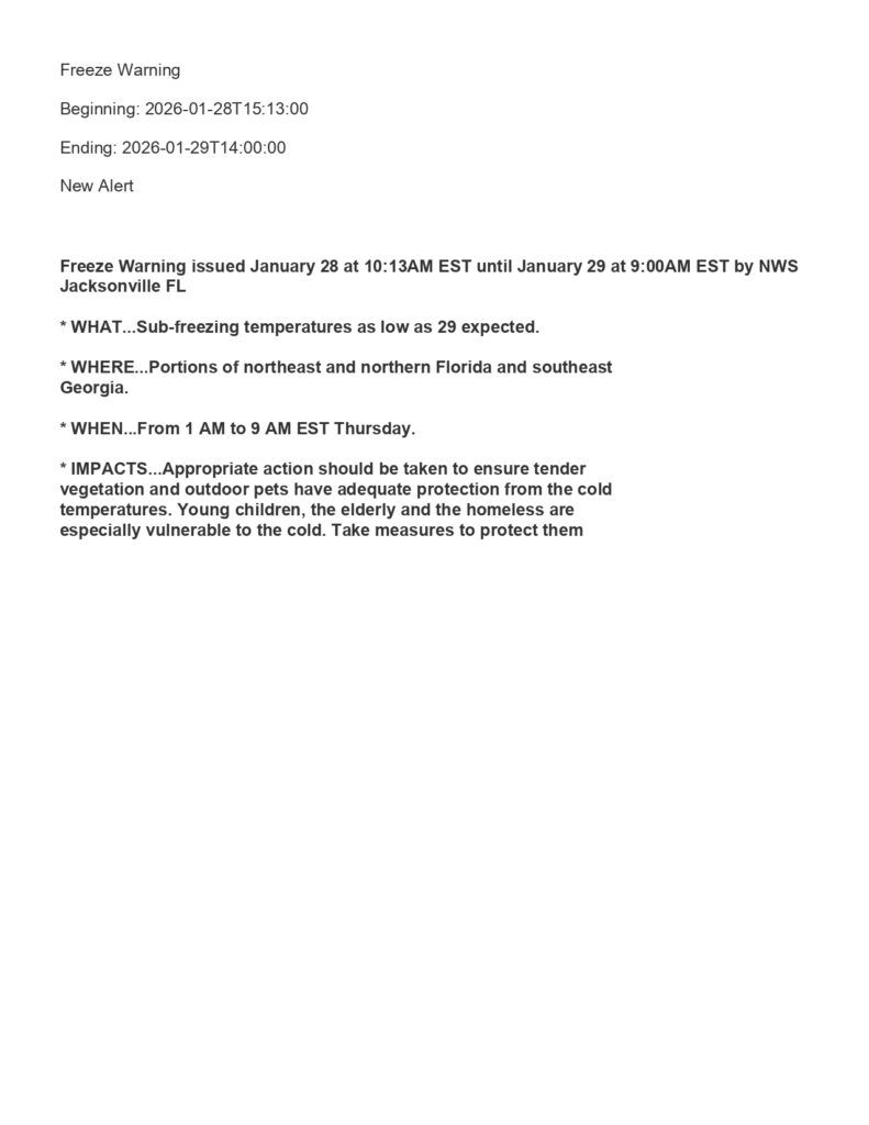 Posted on January 28, 2026 by ana Freeze Warning – January 28 at 10:13AM EST until January 29 at 9:00AM EST
