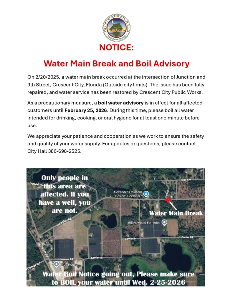 On Feb 20, 2025, a water main break occurred at Junction & 9th Street, Crescent City, FL. The issue has been repaired and water service restored.